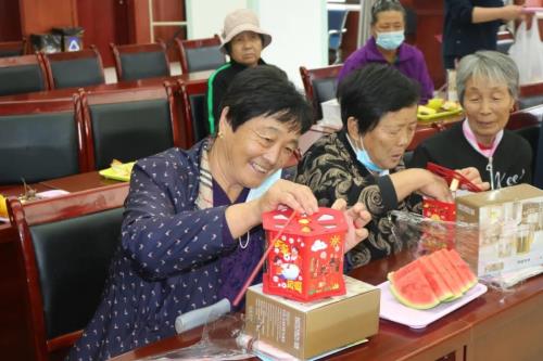 活动最后工作人员邀请老人制作中秋花灯,作品完成后互相展示,拍照留影。活动结束时社区工作人员还为每位老人送了香甜可口的月饼,并提前为他们送上中秋节日最美好的祝福。