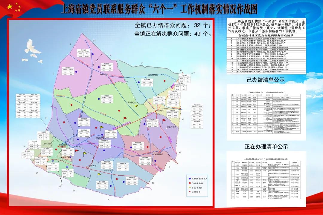 为全面提升“六个一”工作机制落实成效,上海庙镇推广了组织一场培训,动员部署到位;填写一本手册,走访落实到位;绘制一张调度图,承诺公开到位;报送一份月报表,困难解决到位的“四个一”工作法,累计印发“手把手式”走访记录册350本,全镇271名党员联系服务群众978户,公开承诺978条。