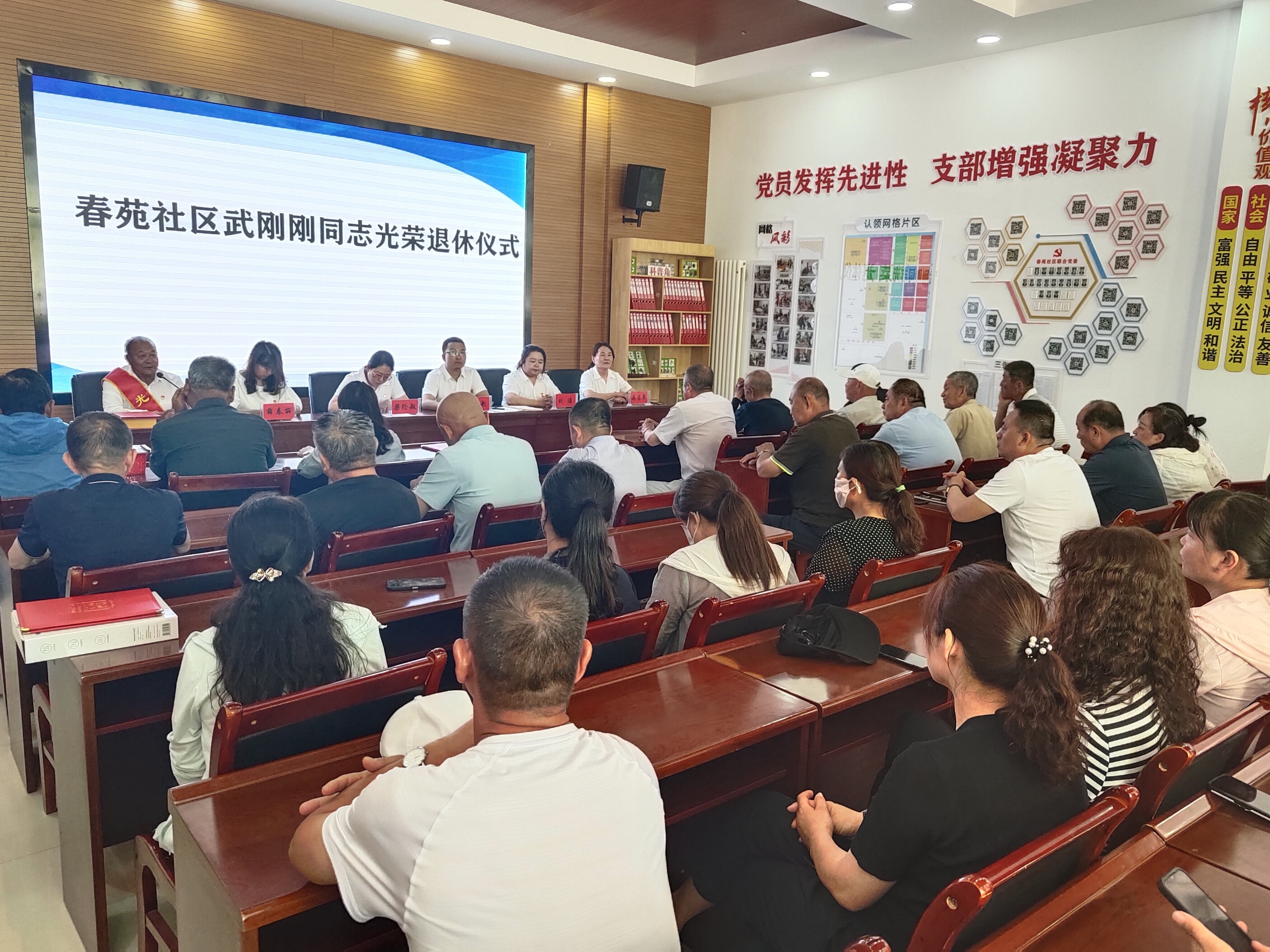 7月7日,春苑社区举行社区工作者光荣退休仪式,为光荣退休的武刚刚同志送上真诚的祝福。