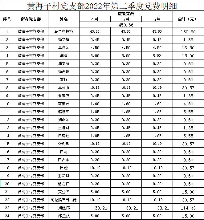 黄海子村党支部2022年第二季度党费明细