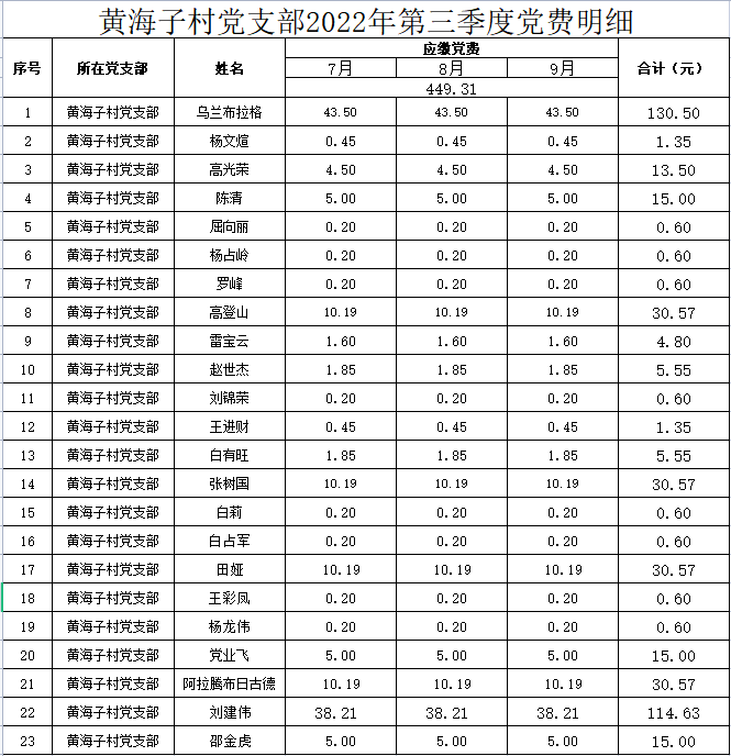 黄海子村党支部2022年第三季度党费明细