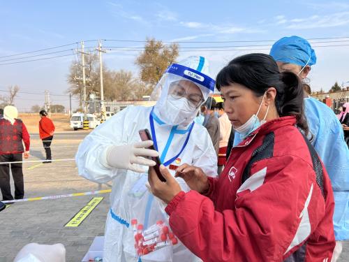 2022年11月15日,全民核酸监测,洪山塘村工作人员为村民服务。