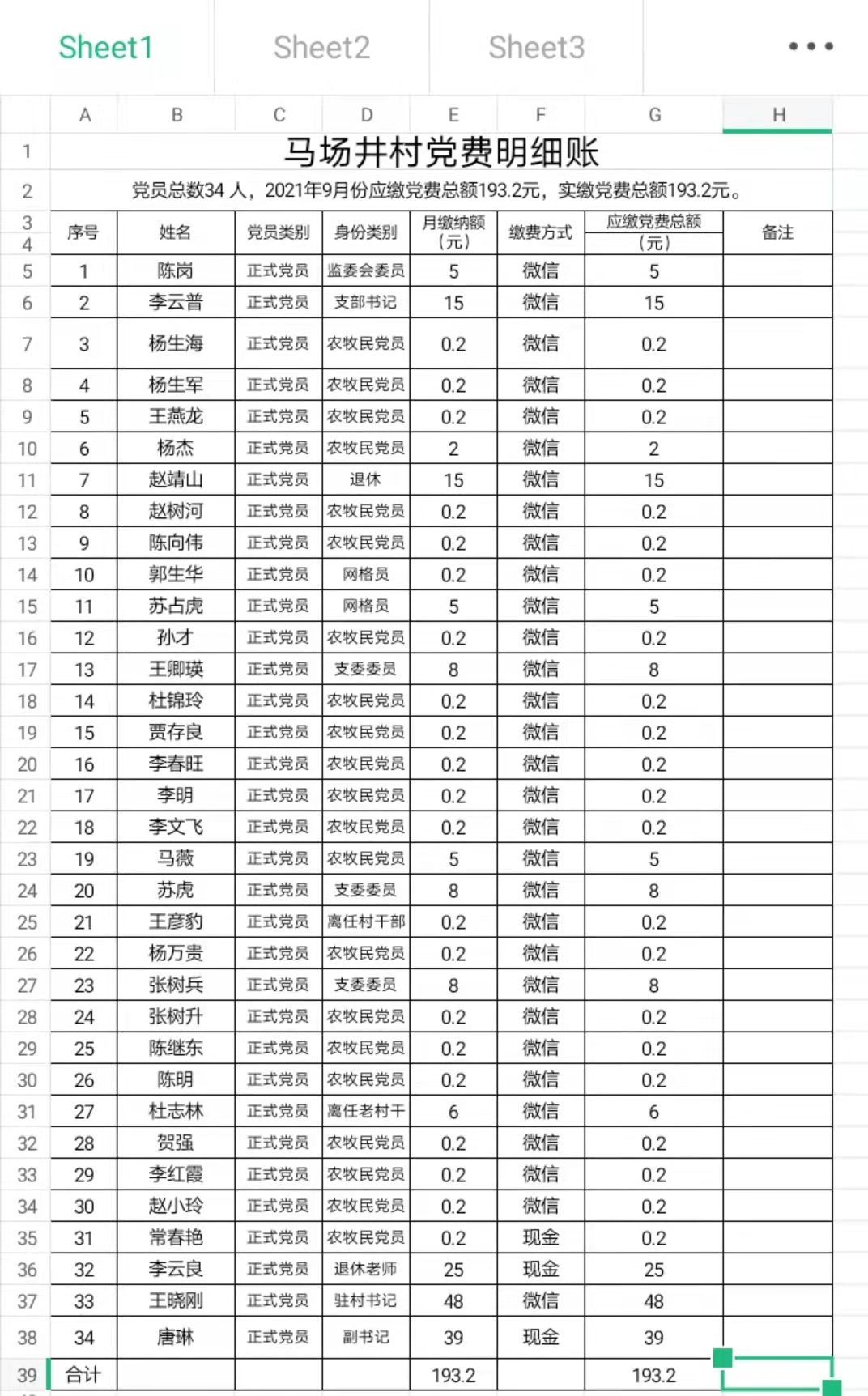 马场井村党员34名,九月应交党费总额193.2元,实交总额193.2元