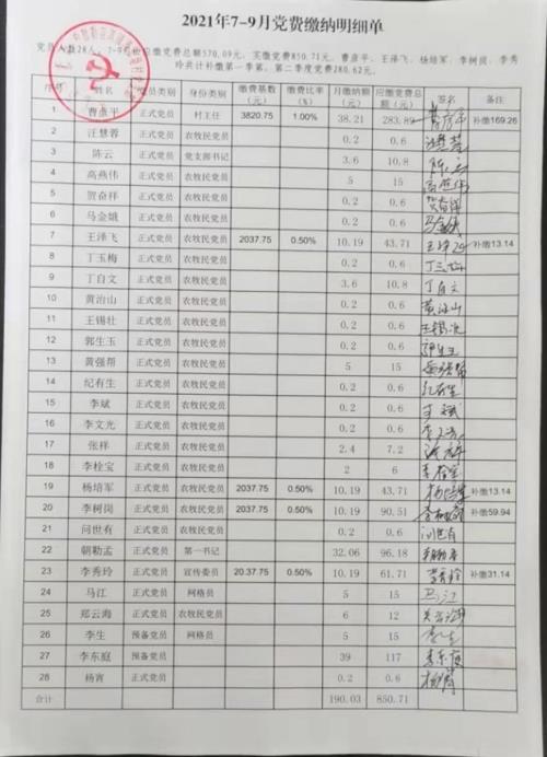 漫水塘村7-9月份党费交纳明细