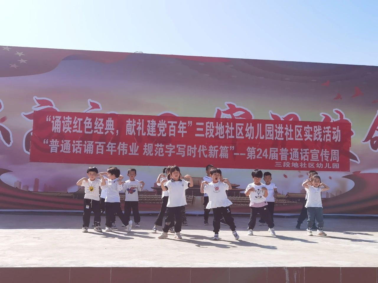 为更好地推广和规范使用国家通用语言文字,提高社区居民的语言文字规范意识和推普参与意识,9月10日上午, 三段地社区联合辖区幼儿园开展“诵读红色经典 献礼建党百年”主题“推广普通话进社区”活动,幼儿园的“小红星”们在党员教师的带领和爸爸妈妈的陪同下一起走进社区,为推广普通话出自己的一份力。