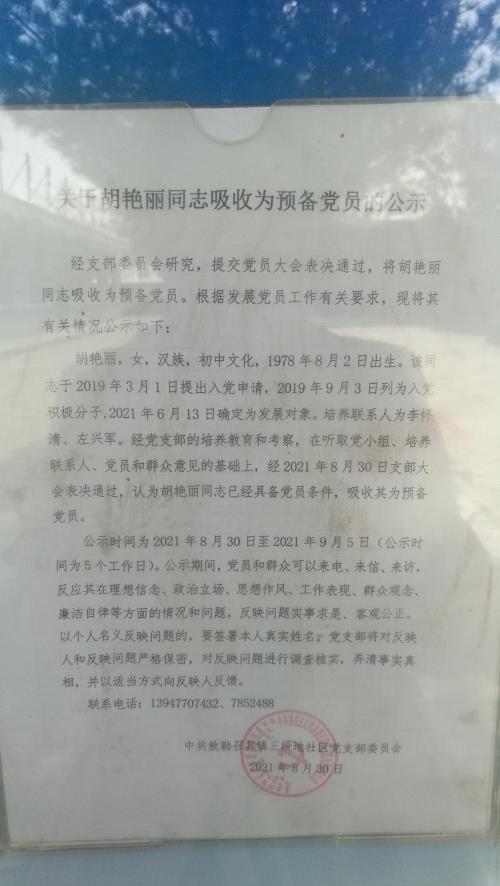 关于胡艳丽同志吸收为预备党员的公示