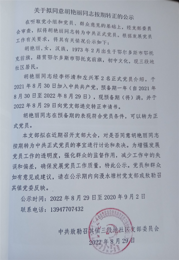 关于你同意胡艳丽同志按期转正的公示