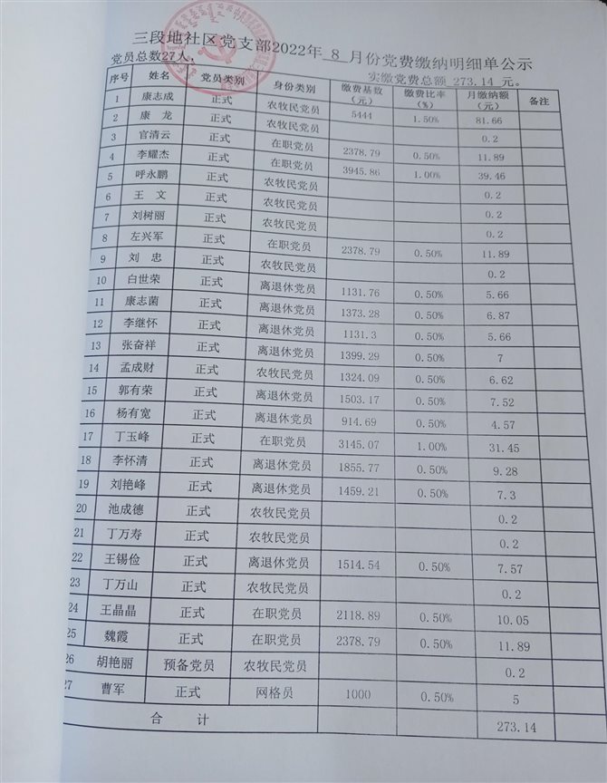 三段地社区2022年8月党费缴纳