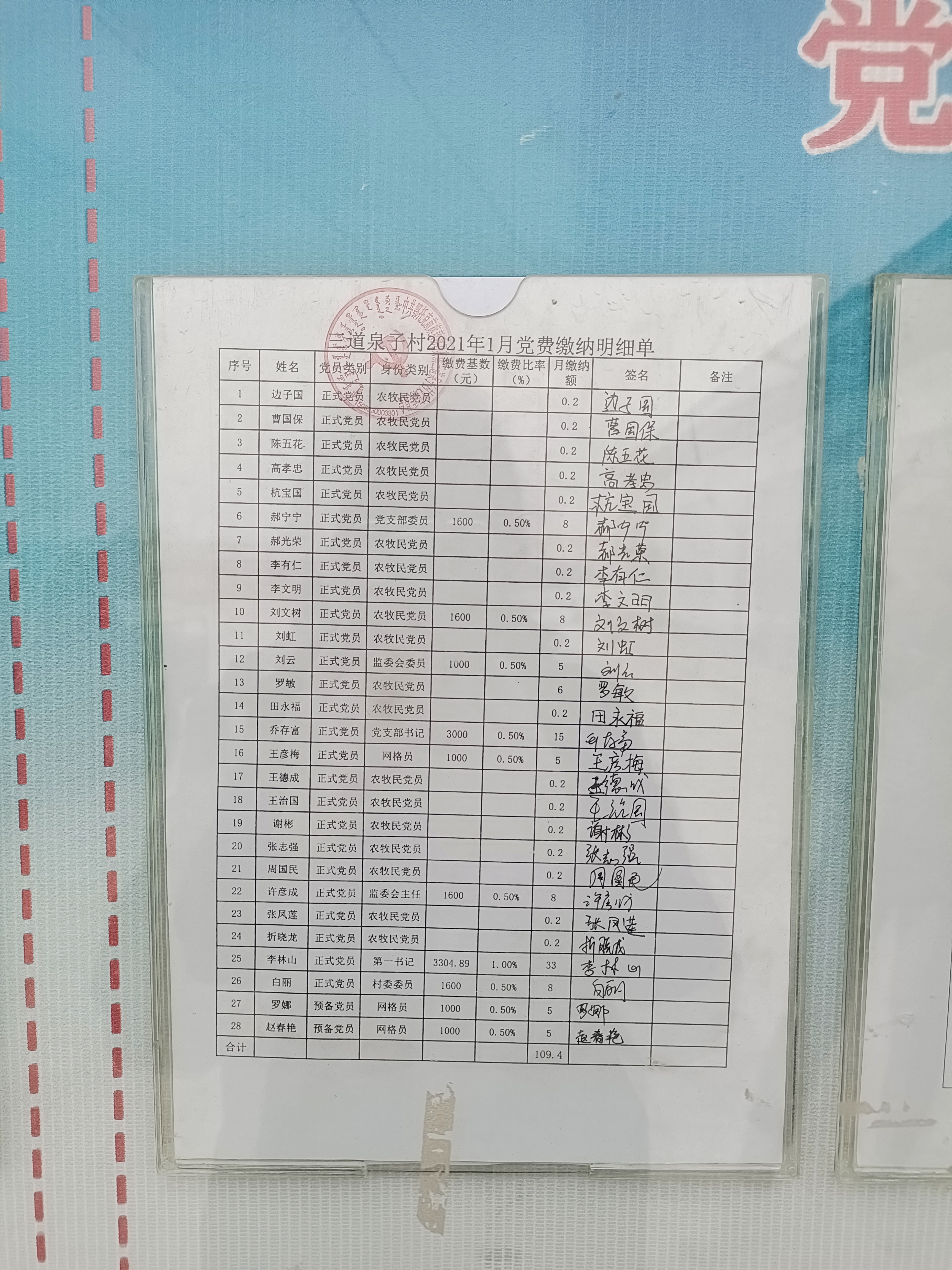 三道泉子村2021年1月份党费公开