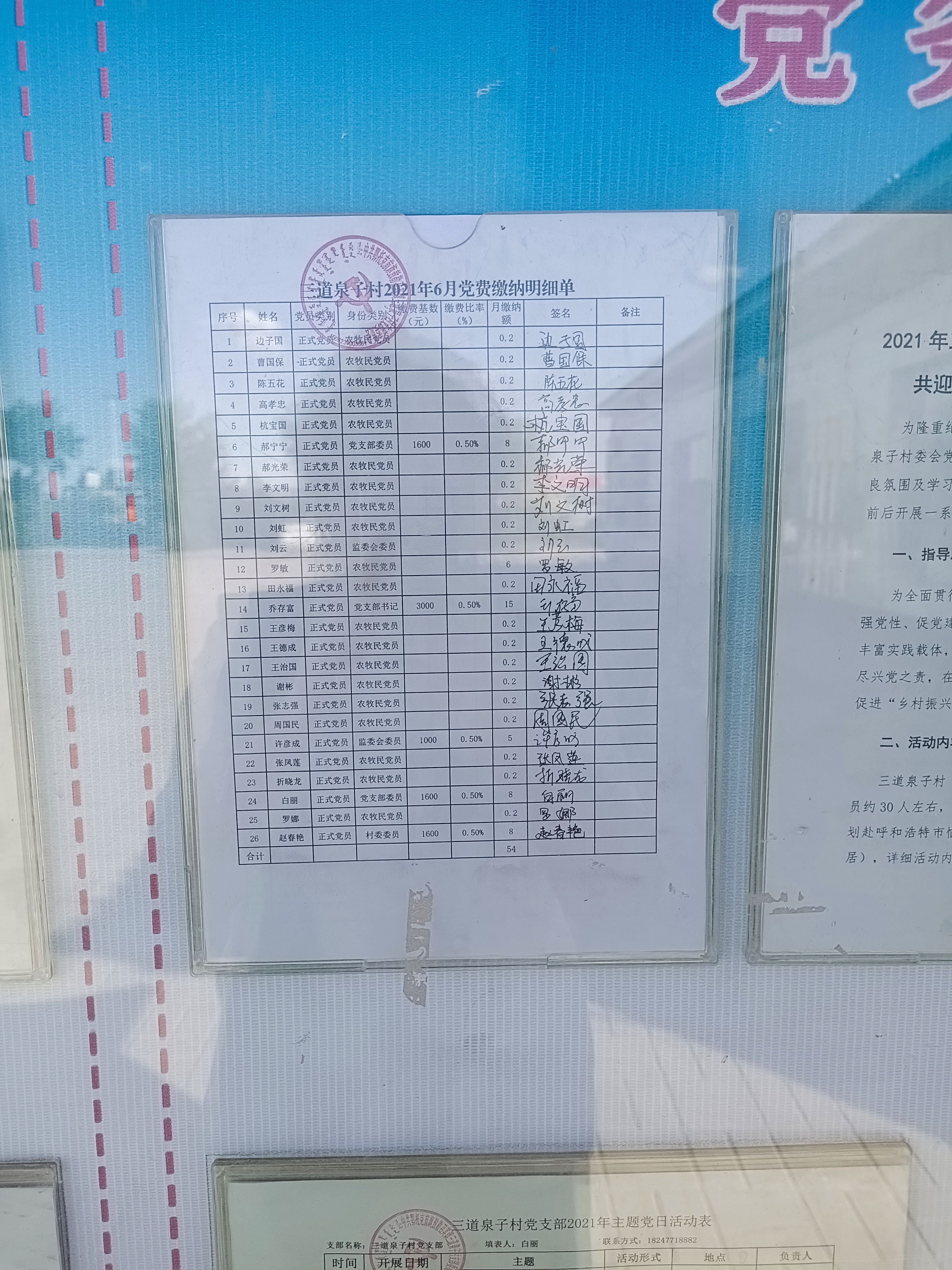 三道泉子村2021年6月份党费公开