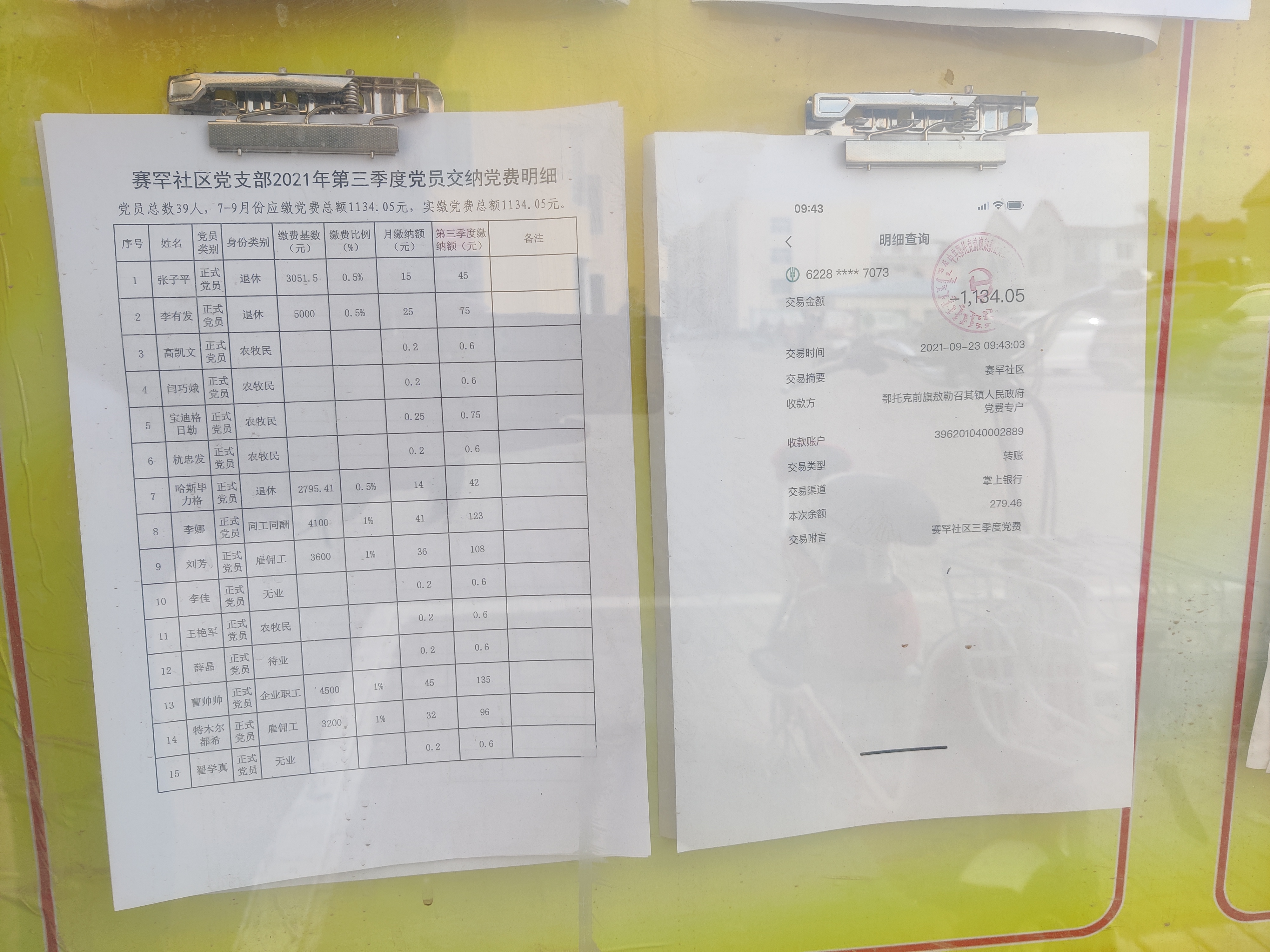 赛罕社区第三季度党费公示